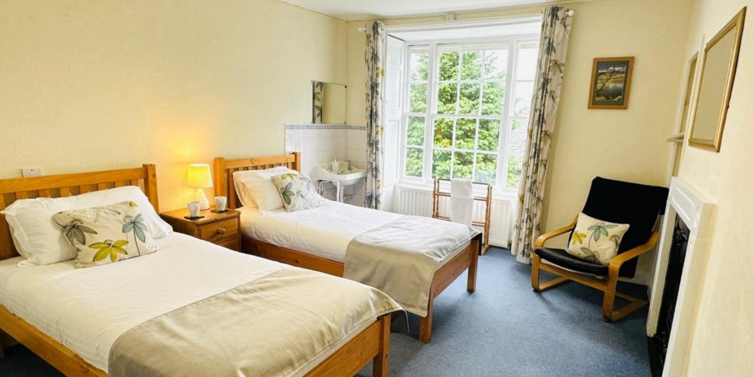 On the first floor are four generous bedrooms, with original feature fireplaces and large picture windows with fell views. There is one king size and one twin bedroom, both with wash basin. The family bedroom features both a four-poster and single bed. There is also a single bedroom with a pretty picture window.